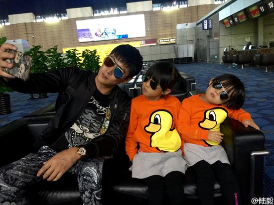 中新網(wǎng)10月22日電 今日,陸毅在微博曬出與兩個女兒在機(jī)場的合照,并稱:“小學(xué)生貝拉著她的書包開啟生日之旅!闭掌,三人都戴著墨鏡,陸毅穿著黑色外套,造型酷炫,兩個女兒則穿著橘黃色卡通上衣,十分可愛。另一張中,貝兒還沖著爸爸陸毅伸舌頭,很是頑皮。