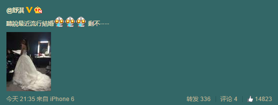 舒淇在微博寫道:“聽說最近流行結婚,剩不 ”照片中,舒淇穿著白色露背款拖地婚紗,面對鏡頭比V賣萌。