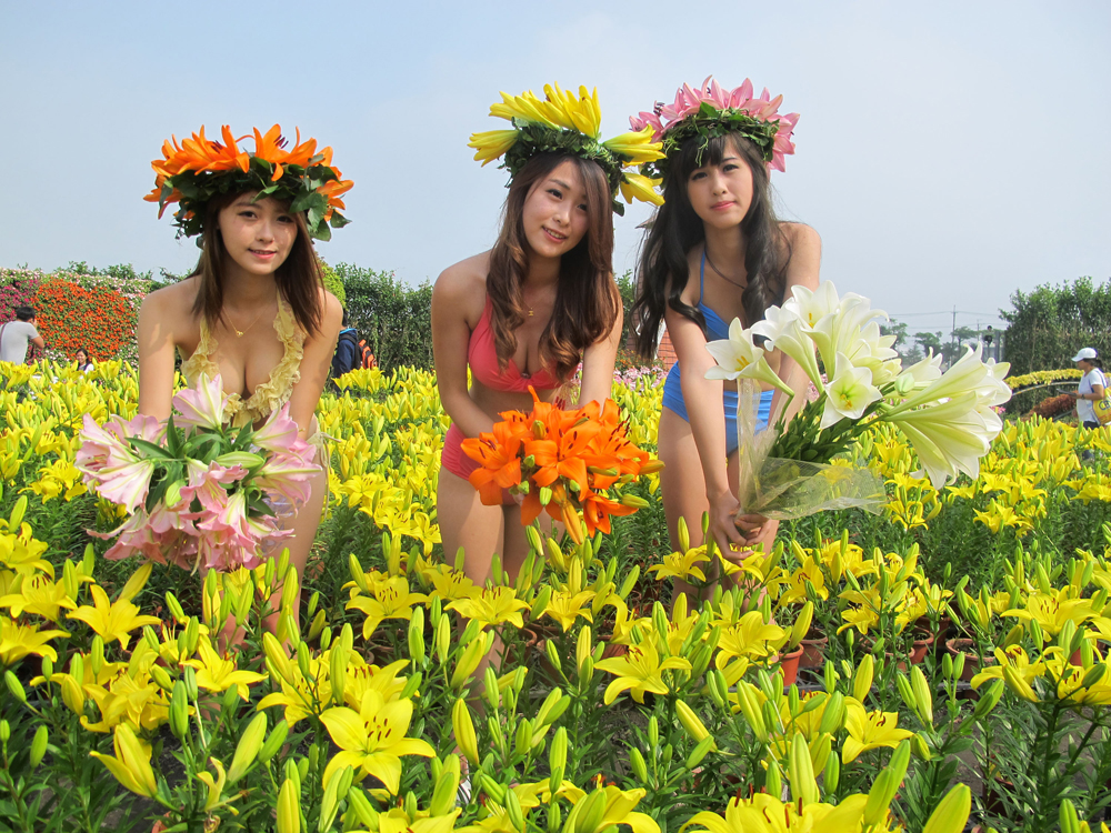 臺中后里區(qū)中社觀光花市自荷蘭引進50多種百合花球莖,利用低溫技術,讓百合花提前一個月開花,29日開幕式上,請來比堅尼辣妹與百合花爭艷。圖片來源:臺灣“中央社”