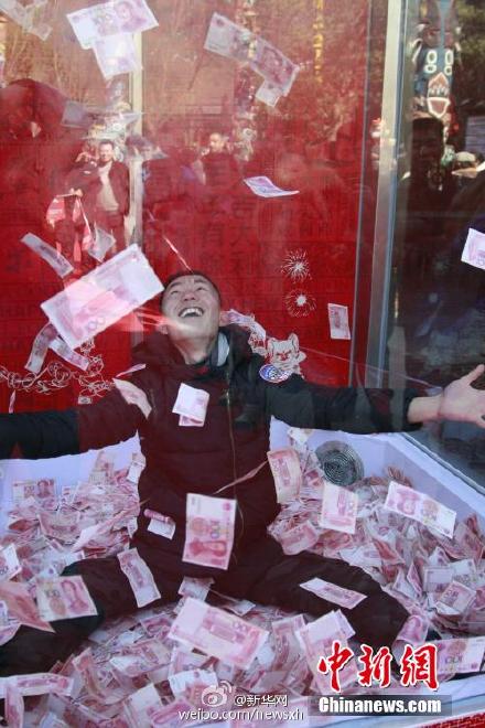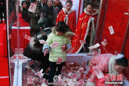 26日,杭州宋城景區給游客派發年終獎。主辦方通過微信征集十位景區游客,在特定區域內限時一分鐘,能抓多少帶走多少。最高一位來自衢州的陸小姐抓到18300元,成為當天抓到最多年終獎的游客。據悉,當天現場現金共有五百萬元。
