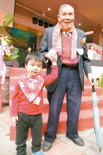 99歲老人王文斌(右)與年僅3歲的王彥鈞(左)都來參加客家山歌比賽。來源:臺灣《聯合報》