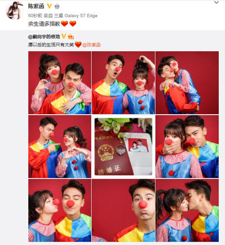 北京時(shí)間5月19日,“古裝專業(yè)戶”陳紫函與男友戴向宇于朝陽區(qū)民政局領(lǐng)證結(jié)婚。并且戴向宇和妻子陳紫函分別在微博曬出結(jié)婚證證實(shí)了這一消息,照片中二人甜蜜依偎,均一臉幸福的笑容。