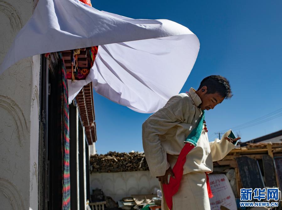 1月14日,在嘎吉林村安置點,村民在新家門前換新裝。新華社記者 普布扎西 攝