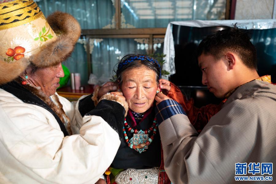 1月14日,在位于嘎吉林村安置點的新家中,村民普赤(中)在家人的幫助下戴耳環(huán)。新華社記者 普布扎西 攝