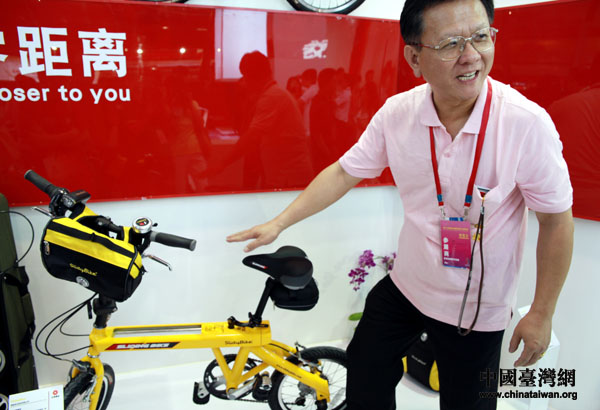 澎錸實業股份有限公司的黃中庸總經理向民眾介紹公司產品——伸縮型單車。(中國臺灣網 鐘寶華 攝)
