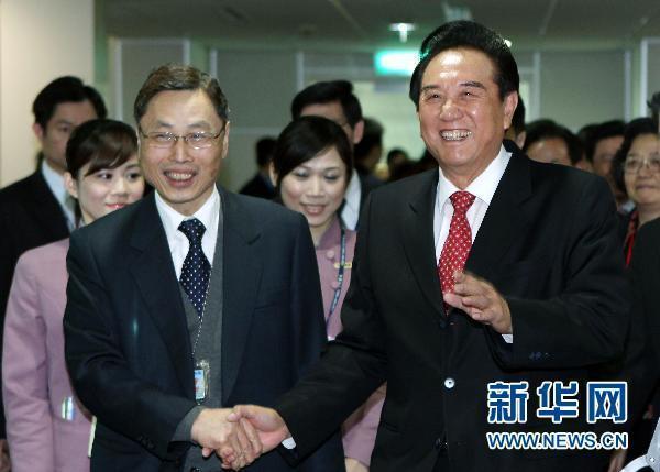 2月23日,海峽兩岸關系協(xié)會會長陳云林(前右)率領海協(xié)會經(jīng)貿(mào)考察團抵達臺北,開始在臺灣的參訪行程。海基會副董事長高孔廉(前左)到機場迎接陳云林一行。新華社記者宋立東攝