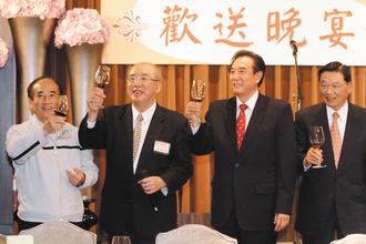 國民黨榮譽主席吳伯雄(左二)昨晚設宴歡送海協會會長陳云林(右二),與“立法院長”王金平(左一)、;鶗麻L江丙坤(右一),一同舉杯。