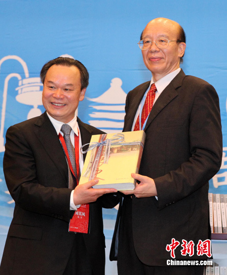 應臺灣大學邀請,校長周其鳳率北京大學134人代表團訪問臺灣,展開北大歷史上規模最大的校際交流活動,并于9日在臺大開展“北京大學日”系列活動。圖為周其鳳(左)與臺大校長李嗣涔(右)互贈圖書。中新社發 路梅 攝