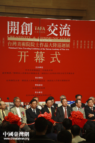 中國(guó)臺(tái)灣網(wǎng)8月22日北京消息 22日上午,由中華文化聯(lián)誼會(huì)、中國(guó)美術(shù)館、臺(tái)灣沈春池文教基金會(huì)、臺(tái)灣美術(shù)院文化藝術(shù)基金會(huì)主辦的《開創(chuàng)·交流——臺(tái)灣美術(shù)院院士作品大陸巡回展》在北京中國(guó)美術(shù)館隆重開幕。臺(tái)灣海基會(huì)董事長(zhǎng)江丙坤、中華文化聯(lián)誼會(huì)顧問(wèn)周和平、全國(guó)臺(tái)灣同胞聯(lián)誼會(huì)會(huì)長(zhǎng)梁國(guó)揚(yáng)、海協(xié)會(huì)副會(huì)長(zhǎng)王富卿等兩岸各界嘉賓300余人出席了展覽開幕式。