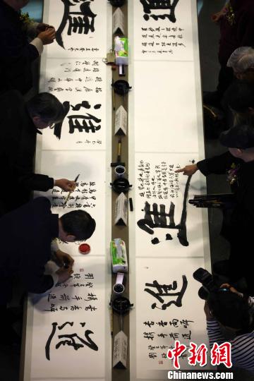 圖為閩臺(tái)知名書(shū)法家揮毫寫(xiě)“進(jìn)”。 董會(huì)峰 攝