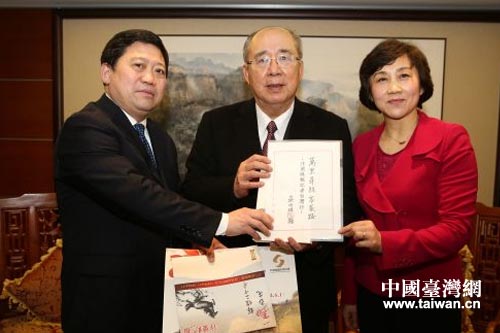 吳伯雄題詞“經濟合作手攜手文化交流心連心”。