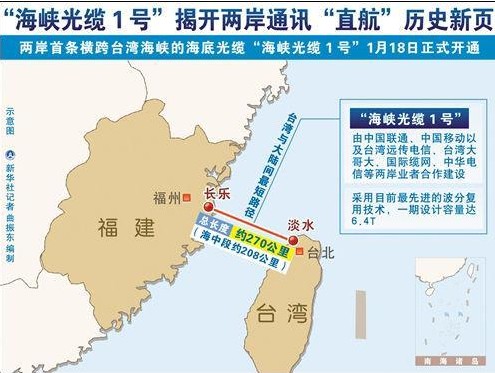中國(guó)聯(lián)通福州海峽兩岸通信業(yè)務(wù)出入口近日已正式竣工。中國(guó)聯(lián)通福建省分公司18日對(duì)此表示,今后可利用福州長(zhǎng)樂至臺(tái)灣淡水的“海峽光纜1號(hào)”(TSE-1海纜)等連接臺(tái)灣地區(qū),改變電路迂回繞接的現(xiàn)狀,真正意義上實(shí)現(xiàn)對(duì)臺(tái)的直達(dá)通信。