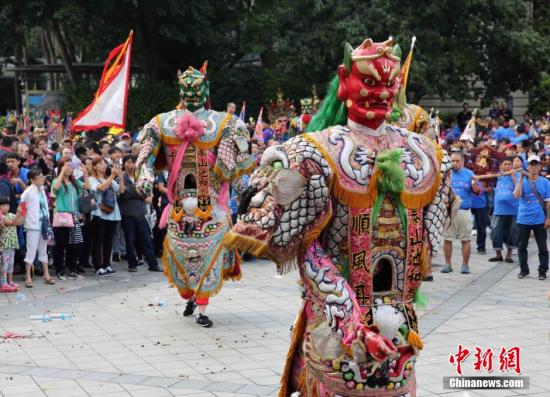 10月25日,多個(gè)民間團(tuán)體在臺(tái)北中山堂、凱達(dá)格蘭大道等地舉辦慶祝臺(tái)灣光復(fù)70周年活動(dòng)。其中,中華統(tǒng)一促進(jìn)黨在中山堂廣場(chǎng)祭祀兩岸抗日烈士英靈,祈愿兩岸和平團(tuán)圓,并結(jié)合各地民間信仰團(tuán)體在傳統(tǒng)老城區(qū)舉辦巡游活動(dòng)。中新社記者 任海霞 攝