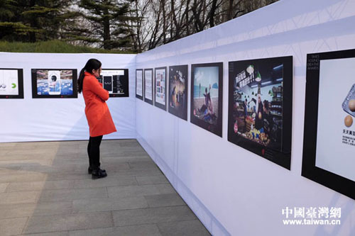 校園外有同學在觀看往屆大賽獲獎作品。(中國臺灣網(wǎng) 普燕 攝)