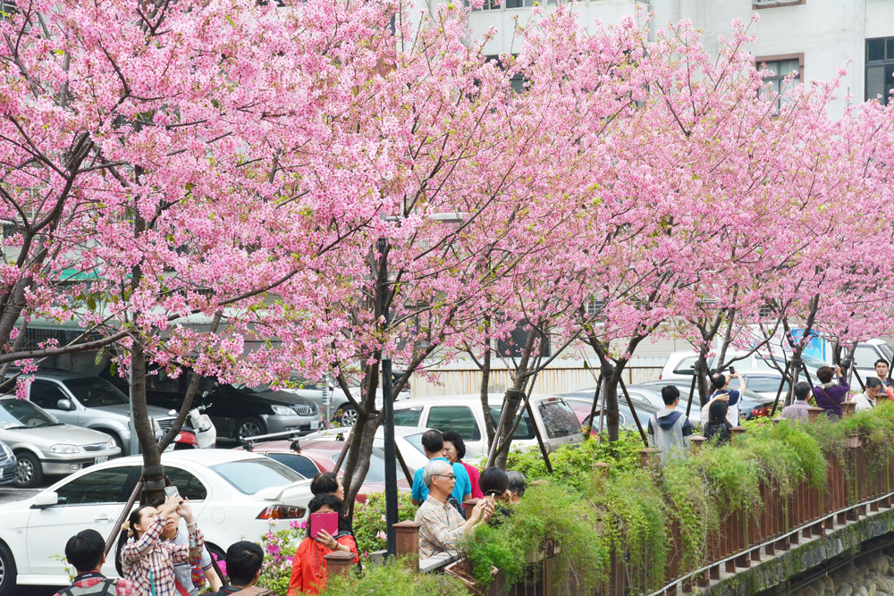 圖:新北市土城區(qū)“希望之河”廣場(chǎng),為新北市內(nèi)難得可坐捷運(yùn)賞櫻花的景點(diǎn),五日擠滿(mǎn)賞櫻人潮,民眾紛紛拿手機(jī)、相機(jī)與粉紅佳人一起留影。(圖片來(lái)源:臺(tái)灣“中央社”)