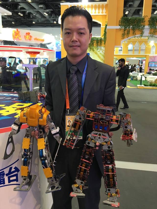 香港館另一處觀者如潮的看點是兩款格斗機械人,這兩個身高40厘米、全身骨骼暴露的錘頭鯊格斗機械人(Tri-Robot T5)可是不折不扣的“武林高手”,據設計者翁永陽介紹,通過自行研發程序及伺服馬達控制板,它們能夠進行快速反擊,“能做出跟人完全一致的格斗動作”,不僅代表了香港同類機械人設計的最高水平,在國際同類型機械人中也屬上流水平。
