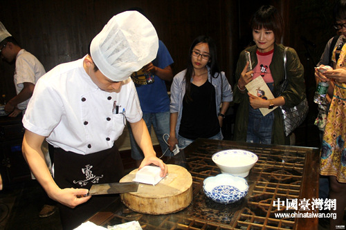 中國淮揚菜博物館的廚藝大師展示切豆腐刀工。(中國臺灣網記者 李杰 攝)