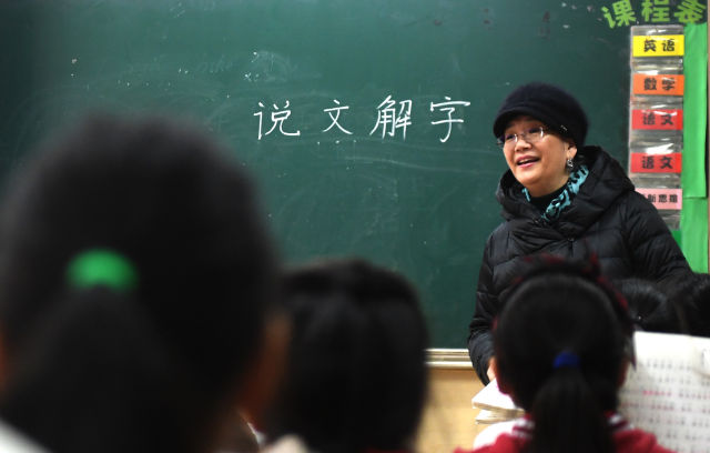 蕭永瑞為武漢外國語學(xué)校美加分校的學(xué)生們上國學(xué)課。(新華社記者程敏攝)