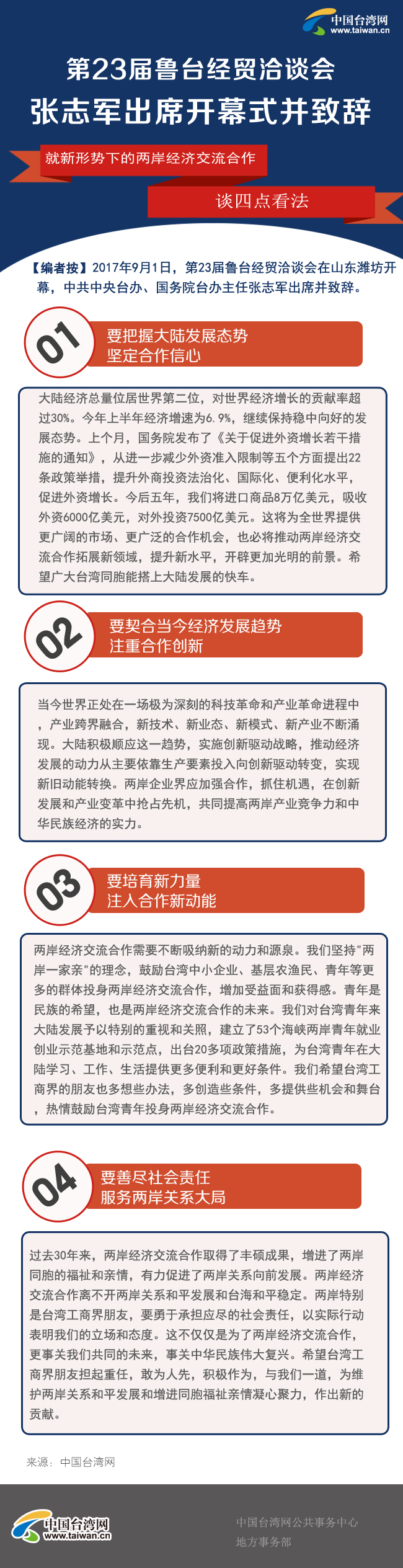 “希望廣大臺灣同胞能搭上大陸發展的快車”——中共中央臺辦、國務院臺辦主任張志軍:改革開放以來,山東經濟社會快速健康發展。在大陸各省區市中,2016年山東省經濟總量位居第三,超過6.7萬億元人民幣。山東基礎設施完善,產業門類齊全,發展潛力巨大,是大陸最具競爭活力的省份之一。山東與臺灣有著深厚的歷史淵源,山東籍的臺胞人數眾多,魯臺合作具有扎實的基礎。山東省委、省政府高度重視對臺交流合作。從上世紀九十年代初到現在,不管臺海形勢如何演變,每年堅持舉辦魯臺經貿交流治談會,至今已是23屆,在大陸舉辦的涉臺經貿活動中創造了一個記錄。山東的這份堅持和執著,結出了魯臺合作的豐碩成果,也成為兩岸關系和平發展的縮影和寫照,展示出兩岸民間交流合作強大的生命力。希望魯臺會持續辦下去,越辦越好。中共中央臺辦、國務院臺辦將一如既往地支持魯臺不斷深化交流合作,并為此繼續作出努力。