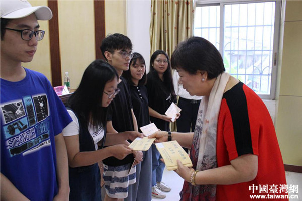 中杰公司劉何玉鈴向學生發放助學金。(圖片來源:肇慶市臺辦)
