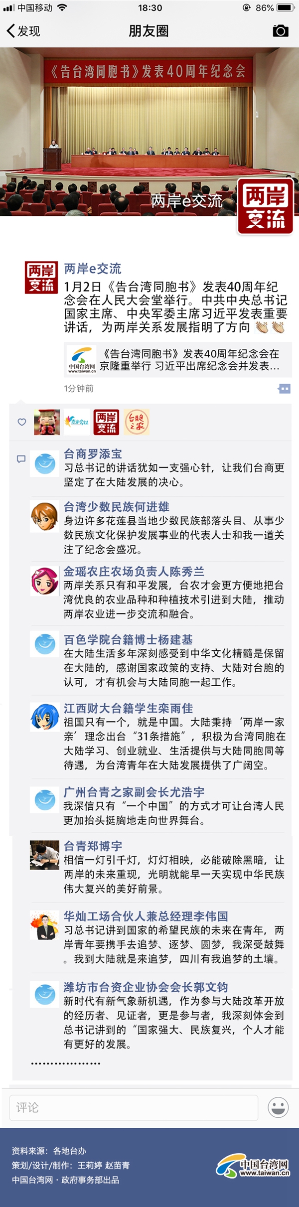 中國臺灣網1月4日訊 1月2日,《告臺灣同胞書》發表40周年紀念會在人民大會堂舉行。中共中央總書記、國家主席、中央軍委主席習近平發表重要講話,科學回答了在民族復興新征程中如何推進祖國和平統一的時代命題。講話在臺胞、臺商之間引起熱烈反響,他們紛紛表示,講話鼓舞人心,堅定了臺胞在大陸發展的信心,為兩岸關系發展指明了方向。
