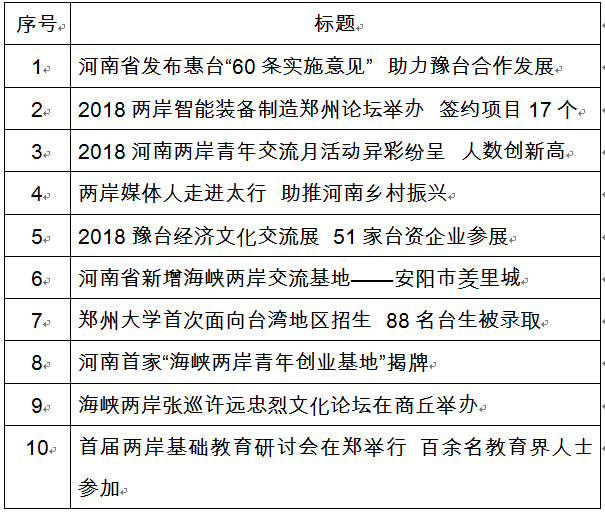 為了進一步宣傳河南省對臺工作所取得的成就,激發社會各界對對臺工作關心、支持和參與熱情,河南省臺辦辦于去年12月28日正式在全省范圍內開展了“2018年河南省涉臺十大新聞”評選活動。結合網絡投票結果,綜合各方面意見,現將“2018年河南省涉臺十大新聞”評選結果公布如下: