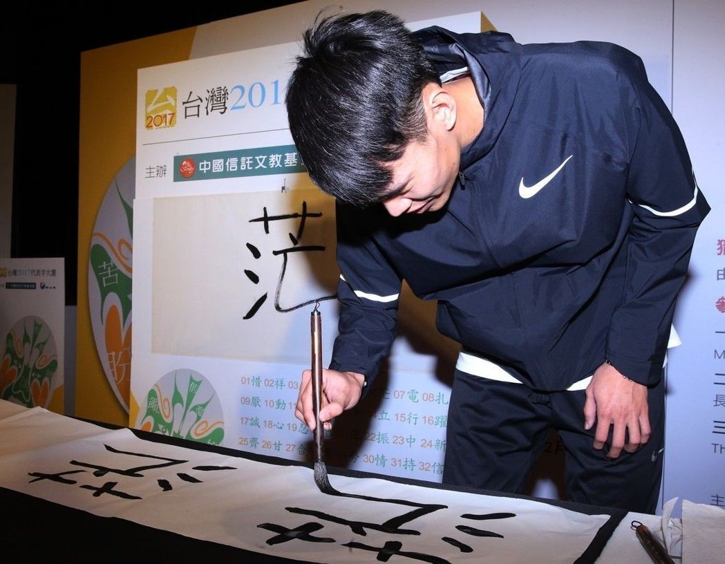 陳奎儒用毛筆寫下臺灣2017代表字“!薄#▓D片來源:臺灣《聯(lián)合報》)