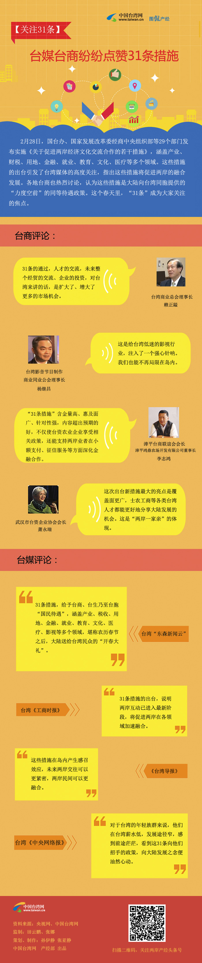 2月28日,國臺辦、國家發展改革委經商中央組織部等29個部門發布實施《關于促進兩岸經濟文化交流合作的若干措施》,涵蓋產業、財稅、用地、金融、就業、教育、文化、醫療等多個領域。這些措施的出臺引發了臺灣媒體的高度關注,指出這些措施將促進兩岸的融合發展。各地臺商也熱烈討論,認為這些措施是大陸向臺灣同胞提供的“力度空前”的同等待遇政策。這個春天里,“31條”成為大家關注的焦點。