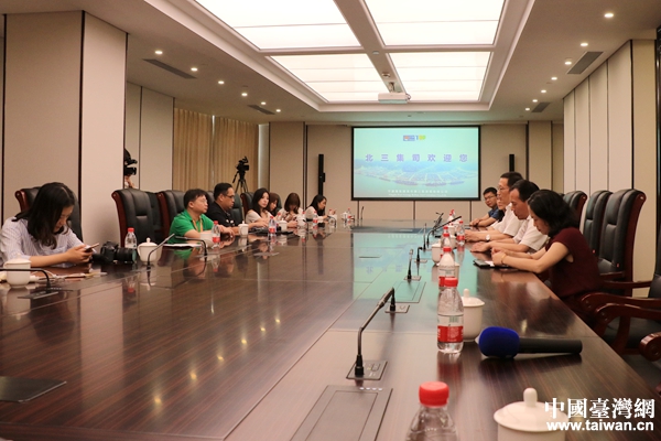 青創(chuàng)基地工作人員為兩岸記者介紹園區(qū)概況。(中國臺(tái)灣網(wǎng) 李奕均 攝)