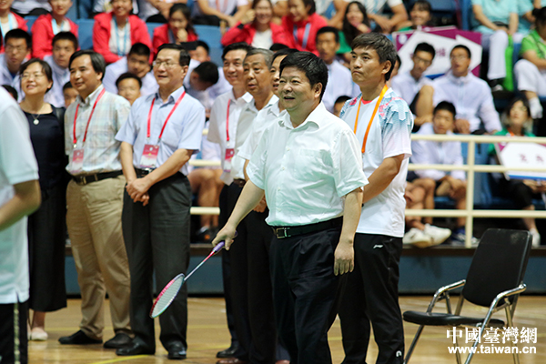 國務院臺辦副主任龍明彪、北京市副市長王寧共同為羽毛球賽開球。