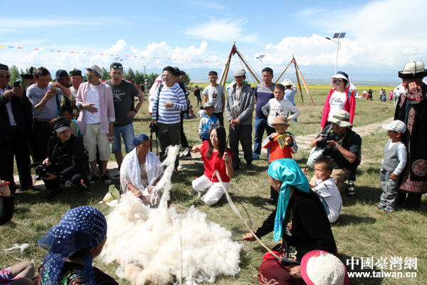臺(tái)灣旅游節(jié)目達(dá)人呂憶雯(紅衣者)體驗(yàn)抽打羊毛。(中國(guó)臺(tái)灣網(wǎng) 王怡然 攝)