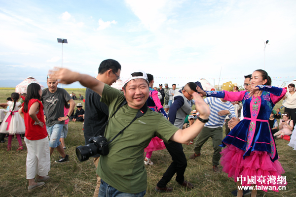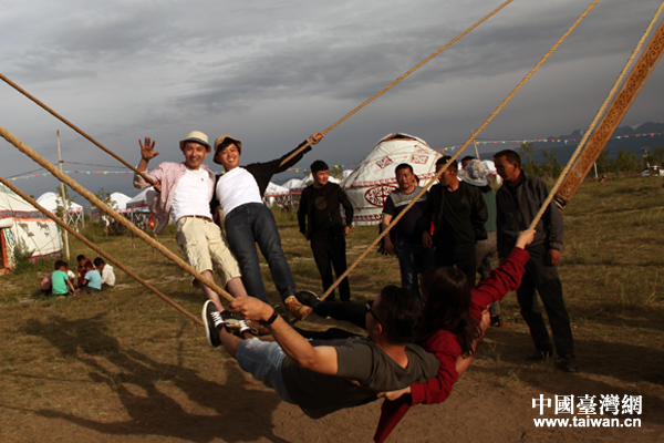 臺(tái)灣90后攝影師楊東霖(右者)體驗(yàn)哈薩克族秋千。(中國(guó)臺(tái)灣網(wǎng) 王怡然 攝)