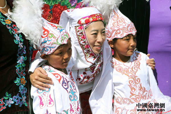 臺(tái)灣旅游節(jié)目達(dá)人呂憶雯頭戴哈薩克族披巾和小朋友合影。(中國(guó)臺(tái)灣網(wǎng) 王怡然 攝)