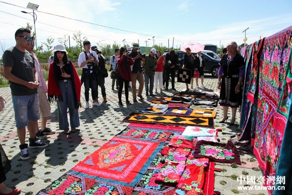 村民向采風(fēng)團(tuán)成員推銷哈薩克族羊毛毯。(中國(guó)臺(tái)灣網(wǎng) 王怡然 攝)