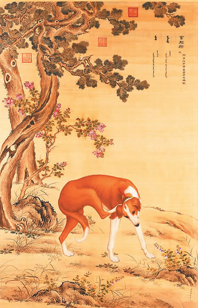 郎世寧在宮廷內創作的《十駿犬圖》軸10幅,畫了10條品種高貴的名犬,分別命名為“霜花鷂”、“睒星狼”、“金翅獫”、“蒼水虬”、“墨玉璃”、“茹黃豹”、“雪爪盧”、“驀空鵲”、“斑錦彪”和“蒼猊”。