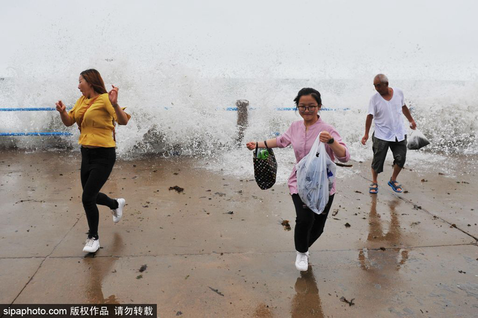 2018年7月12日,山東青島前海大潮,游客不懼“濕身”撿拾大浪沖來的海菜。