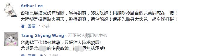 更有網友表示:臺灣的未來在大陸!仇視大陸或與大陸對抗,臺灣是“以卵擊石”,最終受傷的是臺灣自己。