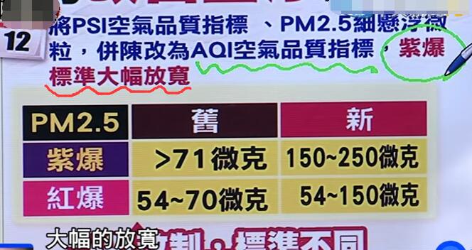 雖然“環保署長”煞有其事的立下了“軍令狀”,但其實人家早已將標準調整了:原本空氣質量指針(AQI)超過70毫克就是“紫爆”,但修改過后標準變成超過150毫克才是“紫爆”,“紅爆”也從70微克的上限放寬到了150微克。如此看來,臺中市“紫爆”天數從去年的99天變成了今年的19天,還真是不奇怪了。有臺媒調侃到:就算明年不幸險些就要超過20%了,那再下調標準不就好了;還諷刺說“環保署長”應該在一開始時就稱要調降50%的目標,這樣會更感人。