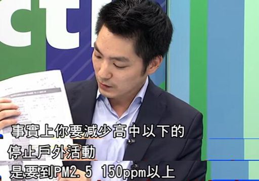對此,國民黨“立委”蔣萬安也向“環保署長”提出質疑,但得到的卻是對方自相矛盾的說法,“我問他,就前兩天的情況看,你會不會鼓勵民眾減少外出?他說當然會。然而實際上環保部門定的管制措施上卻規定,要減少高中以下的戶外活動,PM2.5是要到150ppm以上才可以。也就是說,要達到修改后的空污‘紫爆’標準才可以,這根本是自相矛盾”。