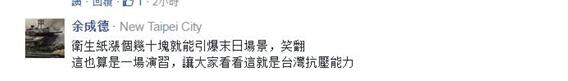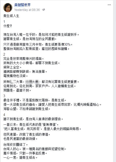 臺(tái)灣政論節(jié)目主持人黃智賢則發(fā)文說,所有大事,都沒有比買衛(wèi)生紙更重要,而“搶不到衛(wèi)生紙,是臺(tái)灣人崩潰的最新理由”;更嘲諷道,一直以來衛(wèi)生紙代表的是“毫無價(jià)值”,但民進(jìn)黨改寫了衛(wèi)生紙的價(jià)值,這“也是民進(jìn)黨的最新政績”了。