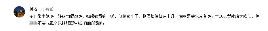 還有人抱怨,其實(shí)不止衛(wèi)生紙,如今臺(tái)灣物價(jià)已經(jīng)全面上漲了,很多民生消費(fèi)品也包括其中,但與大幅上漲的物價(jià)相比,偏偏薪資沒漲(漲了也跟沒漲一樣)……