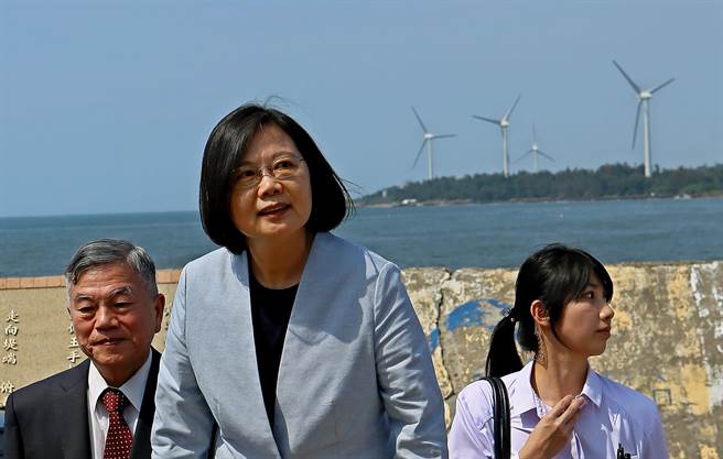 蔡英文(中)5日前往苗栗竹南訪視離岸風(fēng)力發(fā)電示范機(jī)組。(圖片來(lái)源:臺(tái)灣《中時(shí)電子報(bào)》)