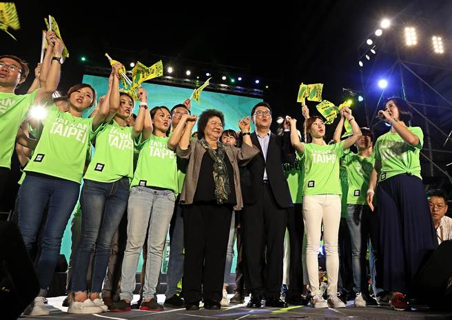 民進黨臺北市長參選人姚文智(右4)23日晚間舉辦首場造勢晚會,凝聚綠營士氣。(圖片來源:臺灣《中時電子報》)