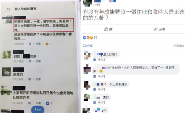 據(jù)“東森新聞云”報(bào)道,臺(tái)當(dāng)局“國(guó)防部”聲稱,部分收件人地址因系統(tǒng)匯出時(shí)產(chǎn)生跳格誤差,導(dǎo)致收件人與地址不符。現(xiàn)正再次進(jìn)行地址資料校對(duì),并同時(shí)進(jìn)行系統(tǒng)資料除錯(cuò),針對(duì)地址資料有誤函件,將于修正后重新寄發(fā)。是否能趕在7月1日前處理完畢?“國(guó)防部”發(fā)言人陳中吉僅稱“目前正在積極處理”。