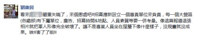 不少看到此圖的網(wǎng)友也有感而發(fā),有人說(shuō)“這比算命擺攤還可憐”,有人嘆“今天的招募員就是明天的你”,有人道“沒(méi)了退休金的保障,募兵制注定失敗”,有人罵“執(zhí)政黨把軍人貶低成這樣,沒(méi)了尊嚴(yán),自然招不到人”,有人盼“國(guó)民黨快起來(lái)挽救軍人的地位、尊嚴(yán)和福利”……當(dāng)然,也有善良的網(wǎng)友向臺(tái)防務(wù)部門(mén)諫言:招募應(yīng)由專責(zé)單位負(fù)責(zé),如此打游擊式的擺攤召募,既無(wú)成效也傷臺(tái)軍形象。