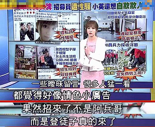 除此之外,就連招個(gè)1年期志愿役軍官都得靠將女士官軍裝照與Facebook、line聯(lián)絡(luò)方式放進(jìn)夾娃娃機(jī)里的做法也讓臺(tái)灣政論節(jié)目主持人和嘉賓痛批:如此化濃妝、穿短裙,并帶有“性暗示”的招募廣告,不僅是一種“詐騙”更是物化女性的表現(xiàn),“真的太欺負(fù)女軍人了”。
