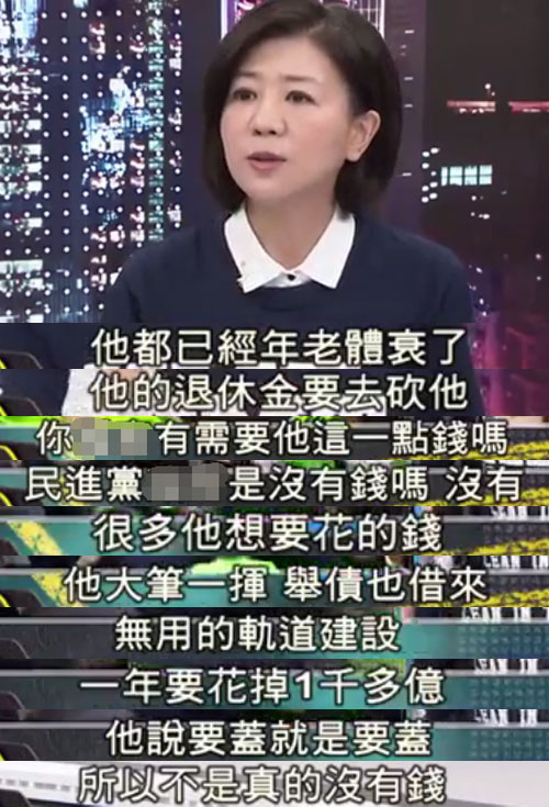 想到之前,島內反對蔡當局“年金改革”的退休軍人團體——“八百壯士”突襲“立法院”事件,最終導致臺退役上?姷律恍覊嫎巧硗觥Q芰艿慕逃枖[在那里,民進黨又為何要不惜一切代價強推該政策呢?難道蔡當局這么缺錢,以至于不砍軍人的退休金就活不下去么?對此,國民黨“立委”王育敏給出了答案:
