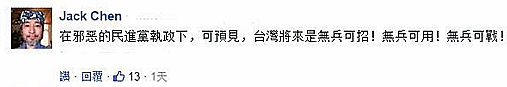 對此,島內網友表示,“污蔑、詆毀軍人的民進黨,居然能夠高票當選臺灣當局的執政者,不禁要心疼這些被當作炮灰的士兵們一秒鐘”;還有人認為,在邪惡的民進黨執政下,臺灣的將來就是無兵可用……