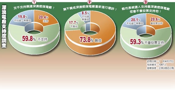 有意思的是,在被問到年底選舉將至,如果縣市長候選人支持深澳電廠,會不會投票給他?近59.3%的人表態不支持,其中有77.4%的泛藍選民表示不會投給支持深澳的候選人,泛綠選民也高達43.9%;至于沒有藍綠傾向的選民,也有53.5%不會投給支持深澳電廠的候選人。