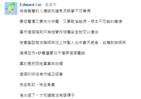 對此,有網友表示,民進黨所謂的“綠色執政,質量保證”就是把百姓當成白癡,等到海水褪去,才知道誰沒穿褲子;還有人認為,就不應該重啟核四為民進黨解套,讓他們繼續作,使民眾看清“綠營”的嘴臉,“讓臺灣以后的子子孫孫都痛罵民進黨。”